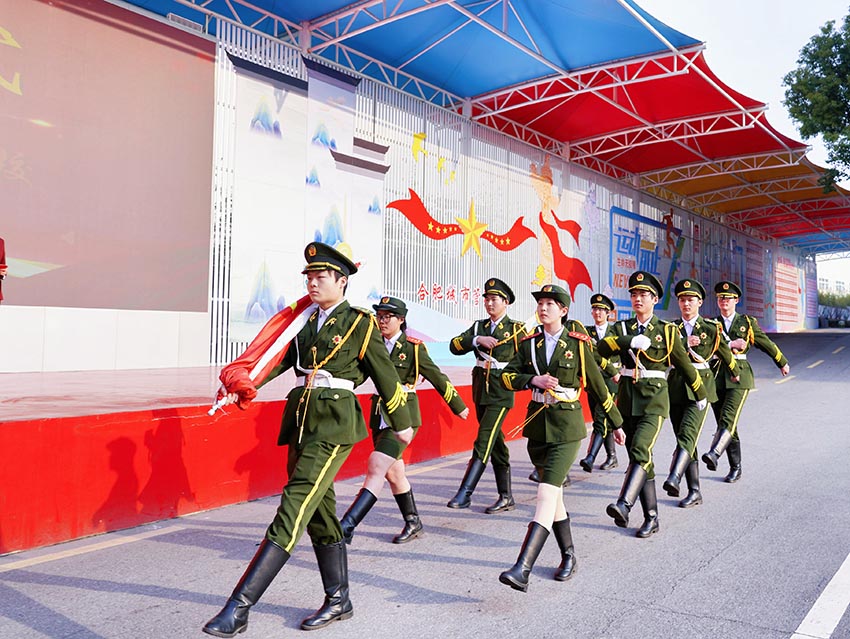 在升旗仪式现场,英姿勃发的国旗护卫队迈着坚定有力的步伐,护卫着鲜艳的五星红旗,向升旗台迈进。随后,五星红旗伴随着激昂雄浑的国歌缓缓升起,全体师生神情肃穆,面向国旗致以注目礼,心中满是对新学期的美好憧憬与热切期待。