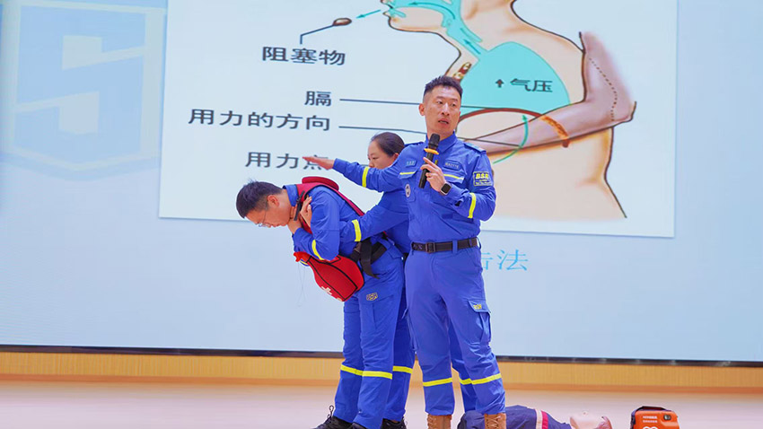讲解海姆立克急救法时,林教官不仅详细介绍了成人、儿童及婴儿不同年龄段的操作差异,还通过模拟场景,演示了气道异物梗阻时的识别要点——如患者双手掐喉、无法发声等典型表现。