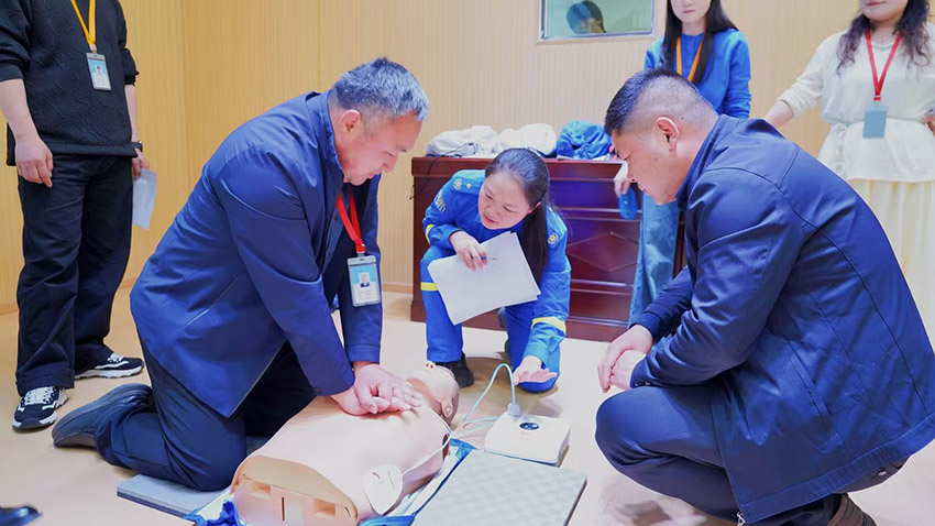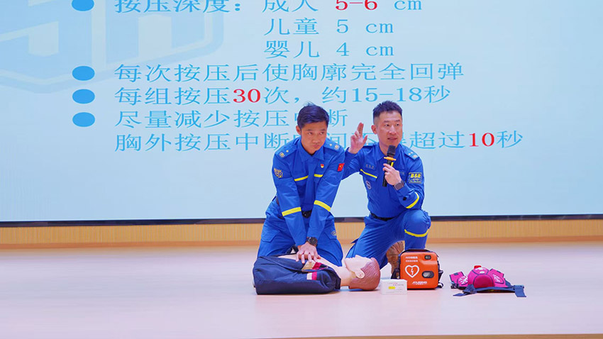 在心肺复苏(CPR)环节,林教官利用人体模型,精准定位按压部位为两乳头连线中点,明确按压深度需达到5-6厘米,按压频率保持在100-120次/分钟。他还特别指出,开放气道时需注意清除患者口腔异物,采用“仰头抬颏法”打开气道,人工呼吸时需确保胸廓有明显起伏。对于AED的使用,林教官详细讲解了开机、粘贴电极片、分析心律、除颤等操作步骤。